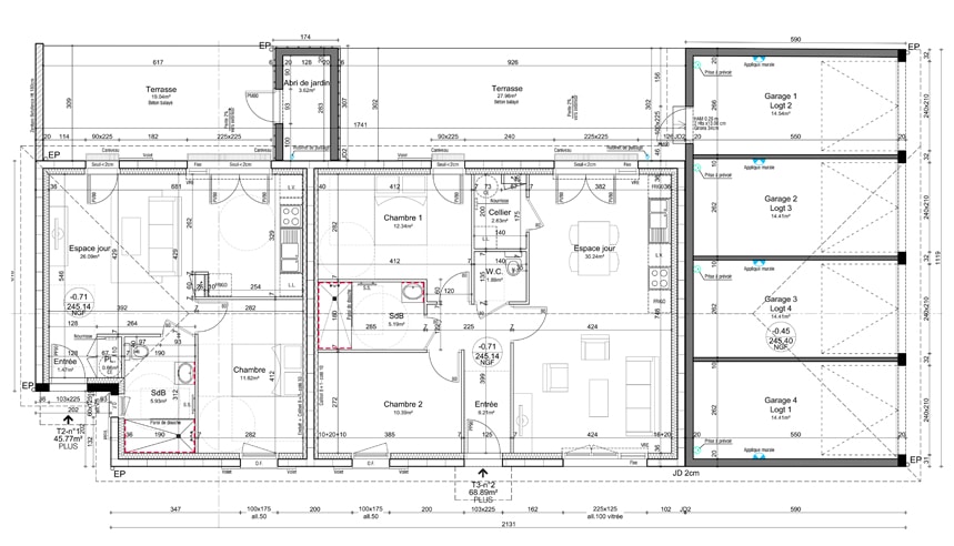 Ce projet, d’une superficie totale de 560 m², comprend deux bâtiments distincts. Le premier abrite un T2 et un T3, tandis que le second accueille quatre T3 en duplex.