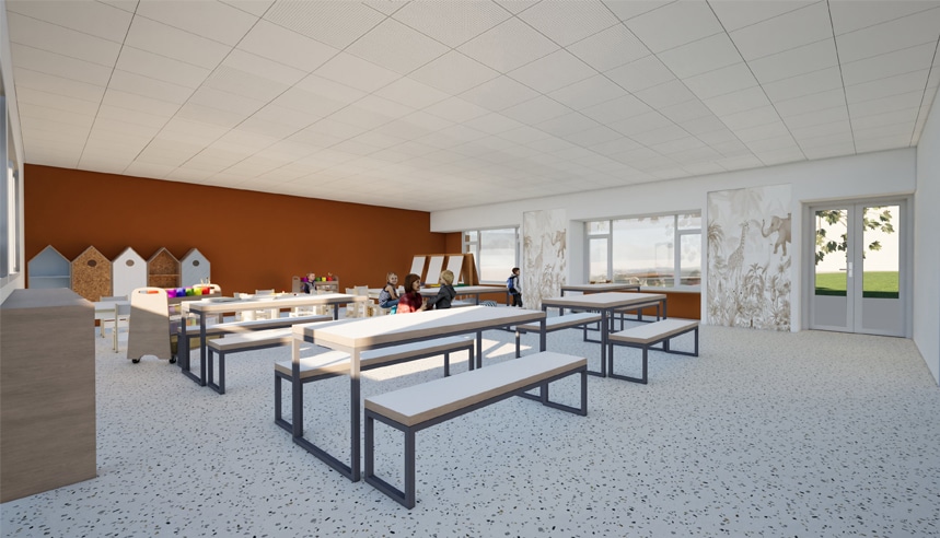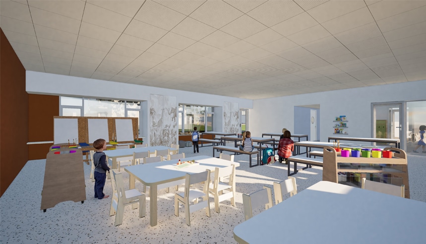 • Des travaux sur les planchers et la gestion du site occupé garantissent la continuité des activités durant le chantier. L’ensemble vise à améliorer la performance énergétique (DPE) et à optimiser le confort des usagers, tout en créant un environnement sûr et accueillant pour les enfants.