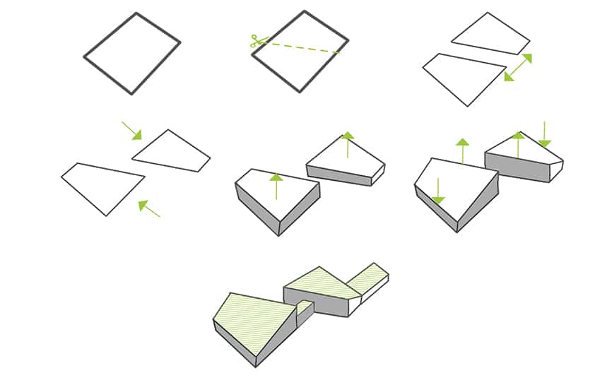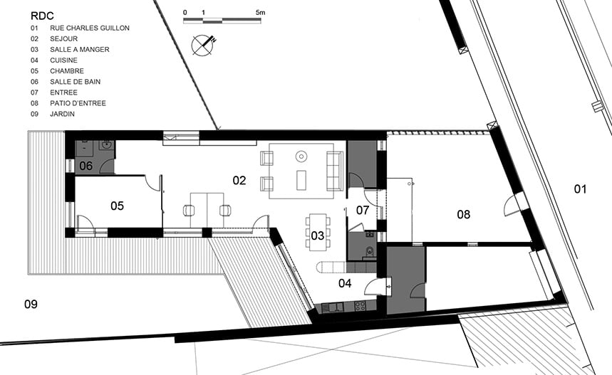 • La géométrie de la parcelle est irrégulière avec des contraintes d’urbanisme fortes. La maison est conçue comme un parcours à travers le terrain. Une cour accueille l’habitant après avoir passé un premier mur existant. Un auvent et un hall d’entrée permettent l’accès au séjour avec un volume sous rampant. La forme originale de la maison ouvre sur un jardin en cœur d’îlot.