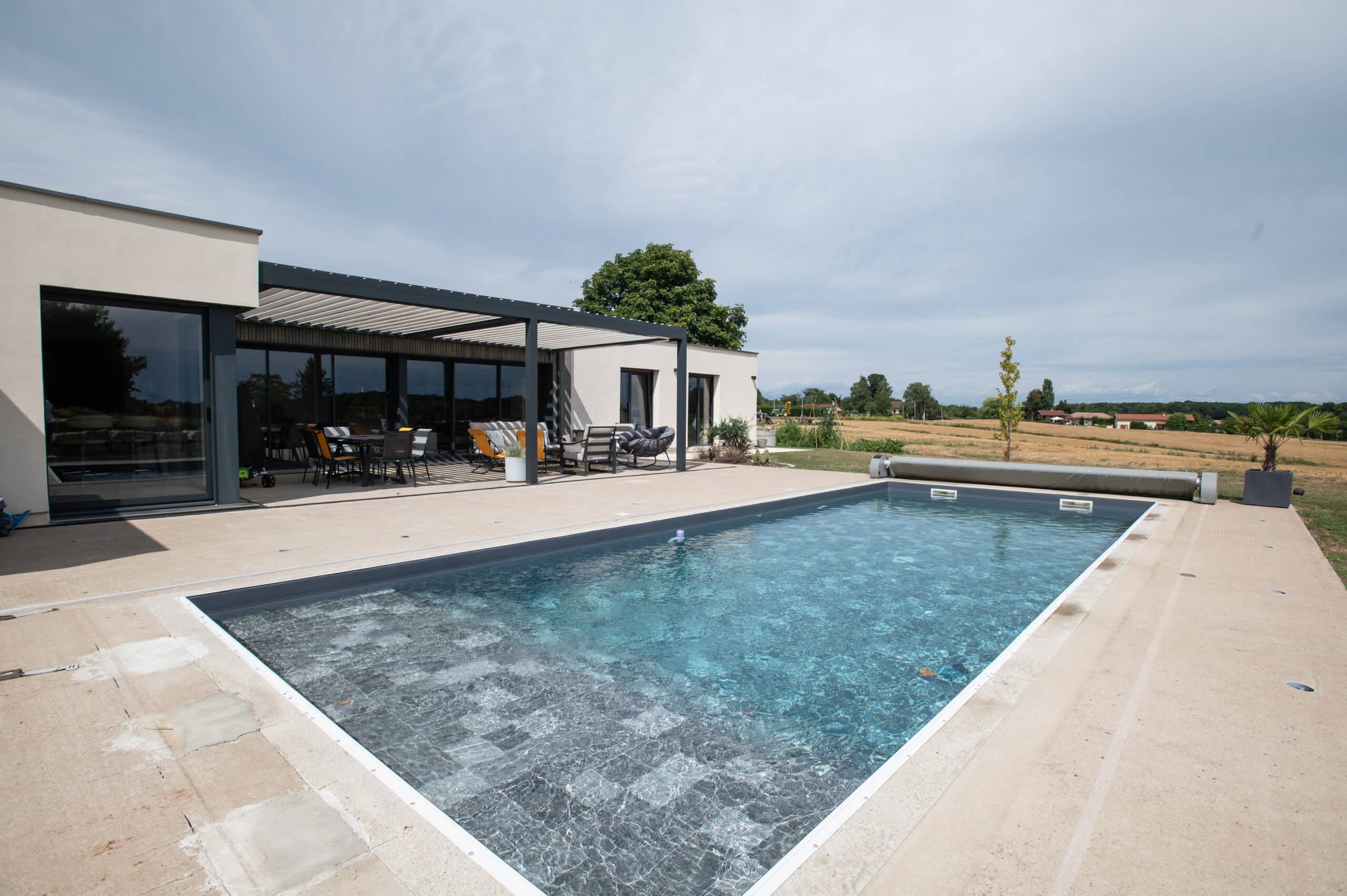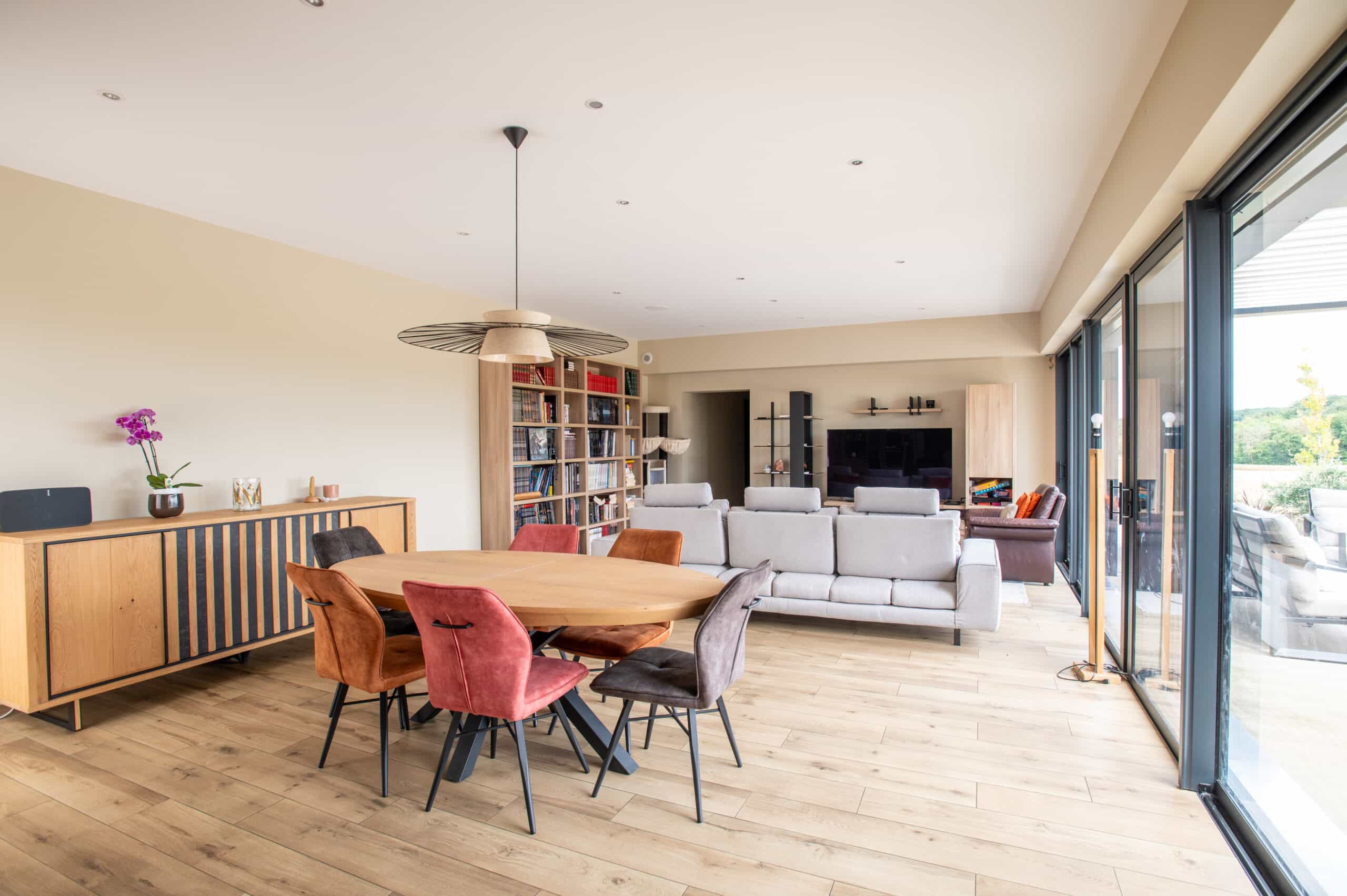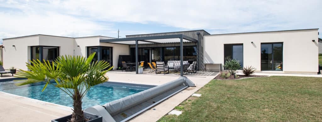 Cette maison contemporaine à ossature bois, conçue en forme de L, allie performance énergétique et confort estival. Pensée comme une villa passive, elle intègre des solutions durables et responsables : isolation en laine de bois, VMC double flux, toiture-terrasse végétalisée, panneaux solaires et géothermie.