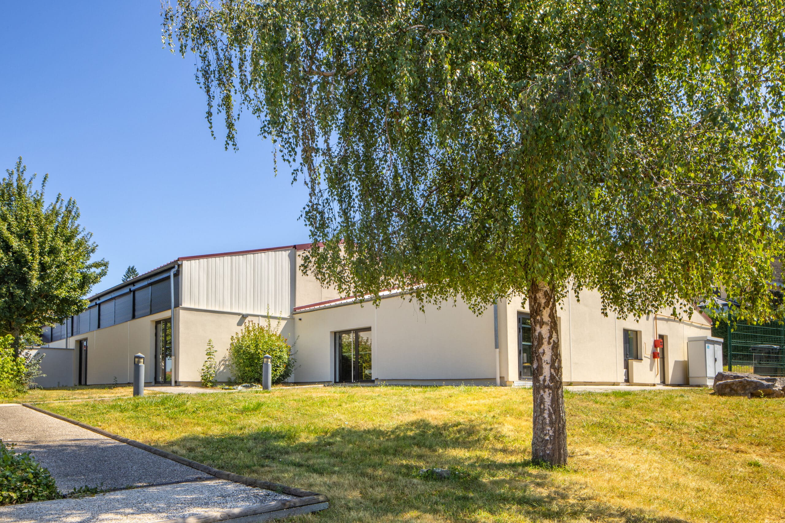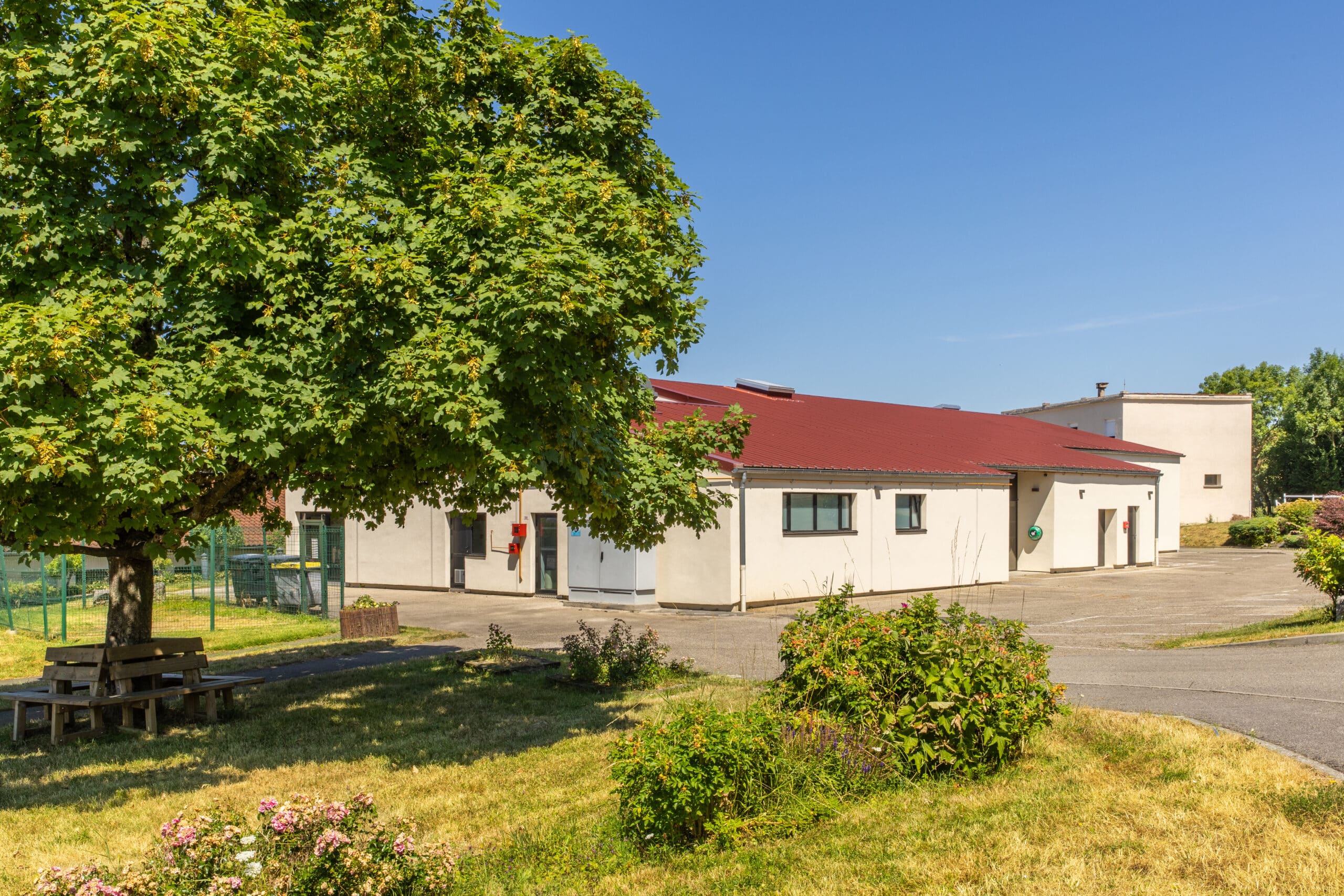 La réhabilitation de la salle polyvalente transforme l’espace en un lieu chaleureux, élégant et acoustiquement performant. Les murs, habillés de panneaux en bois, et le renouvellement des dalles du faux plafond créent une atmosphère harmonieuse et accueillante.