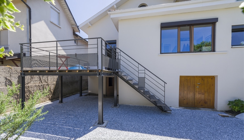 • En façade nord, une terrasse en lame de bois avec un escalier en structure galvanisée crée une liaison directe entre la cuisine et le jardin.